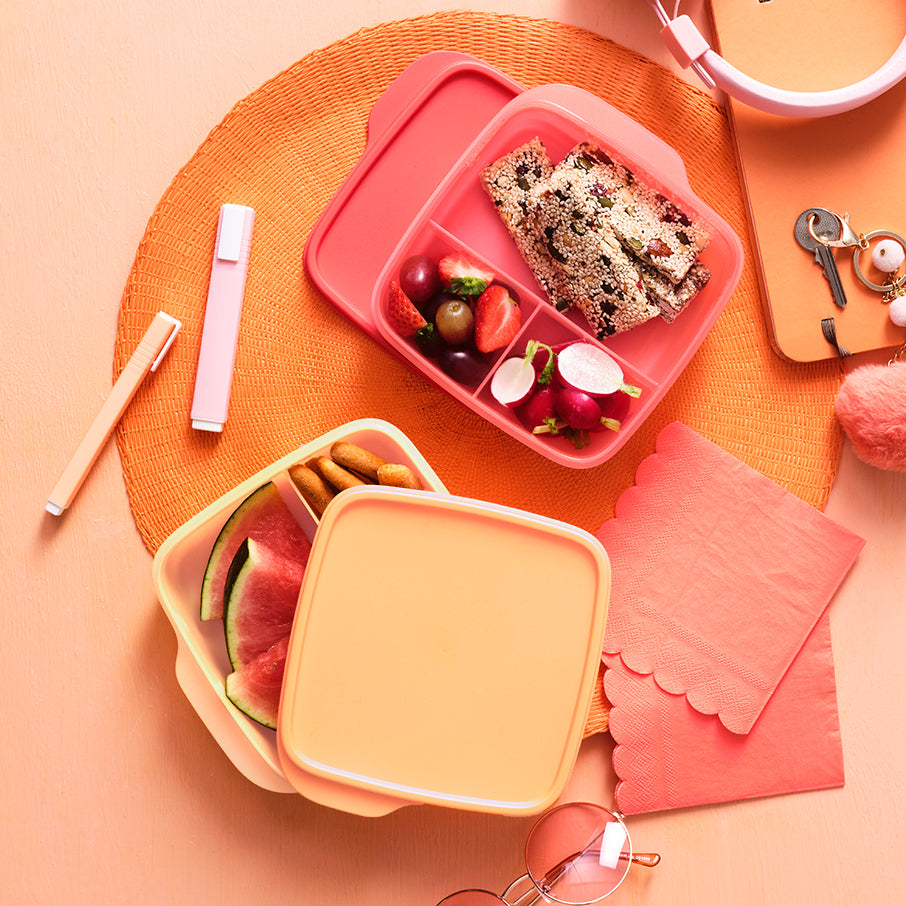 Set includes two containers, each with one 1⅓-cup/340 mL and two ⅓-cup/105 mL separated compartments and airtight seals.