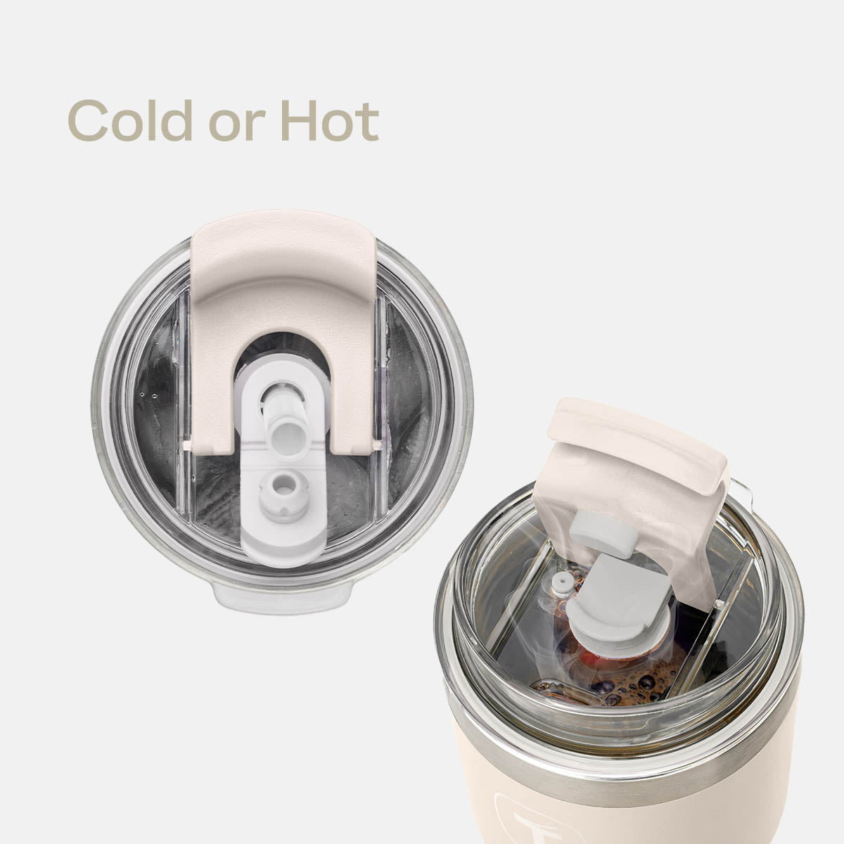 • Straw in or spout open: For cold drinks, pop the straw in the 2-in-1 lid. For hot beverages, flip the lid to sip from the spout.