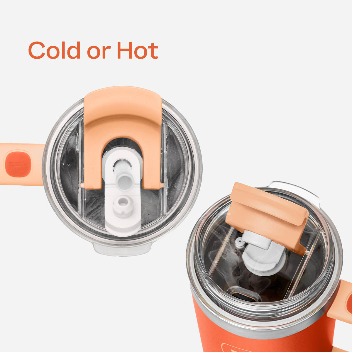 *Tupperware® big T Tumbler is for use with beverages up to 167°F / 75°C with straw removed—at hotter temperatures, leaks and burn injuries can occur. **Content stays above 60°C with a starting temperature of 167°F / 75°C for the hot claim and below 61°F / 16°C with a starting temperature of 40°F / 4°C for the cold claim.